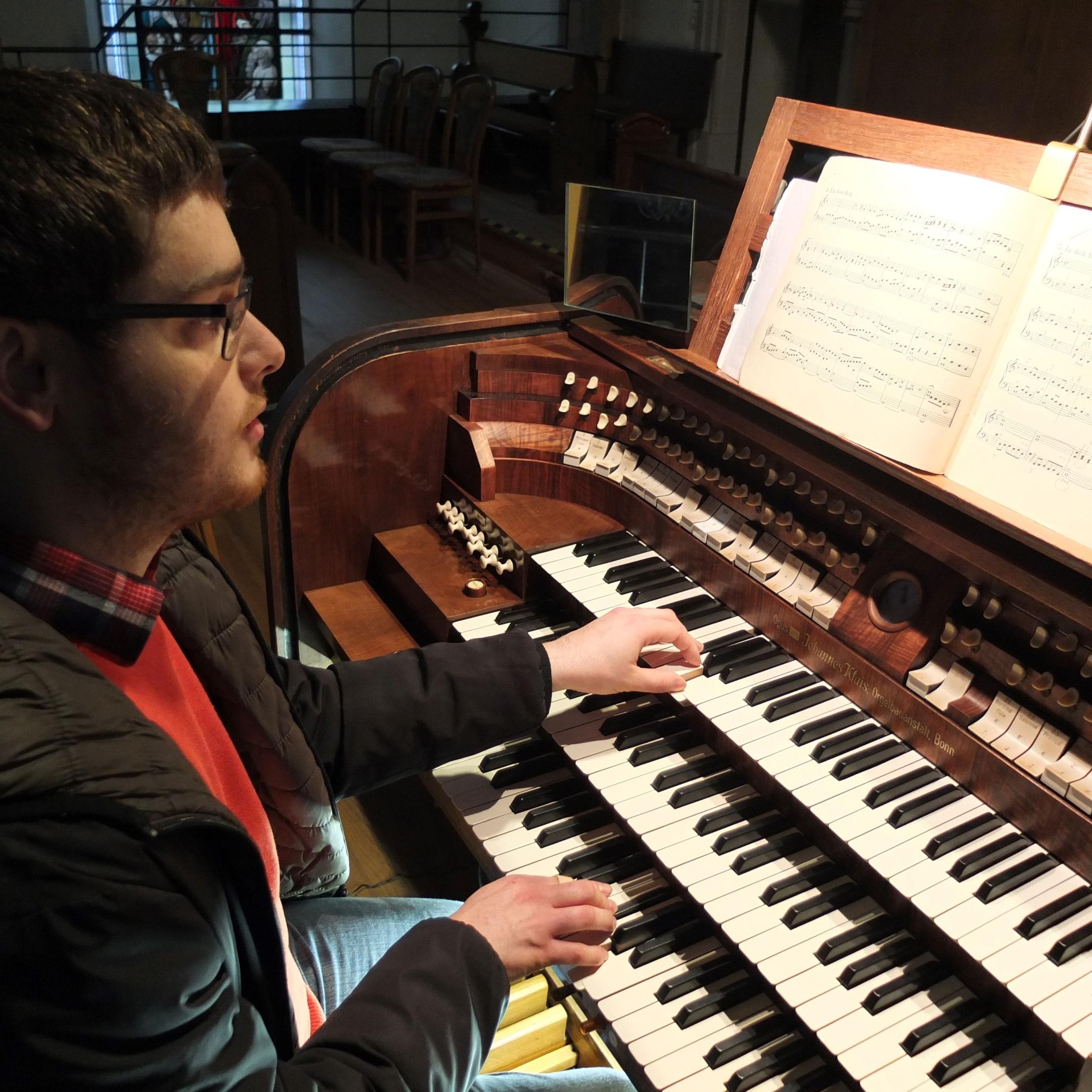 30 % seiner Tätigkeit ist er für die Pfarrgemeinde Maria Himmelfahrt aktiv. Er spielt die Sonn- bzw. Feiertagsmessen und leitet den Kirchen- und den Jugendchor.